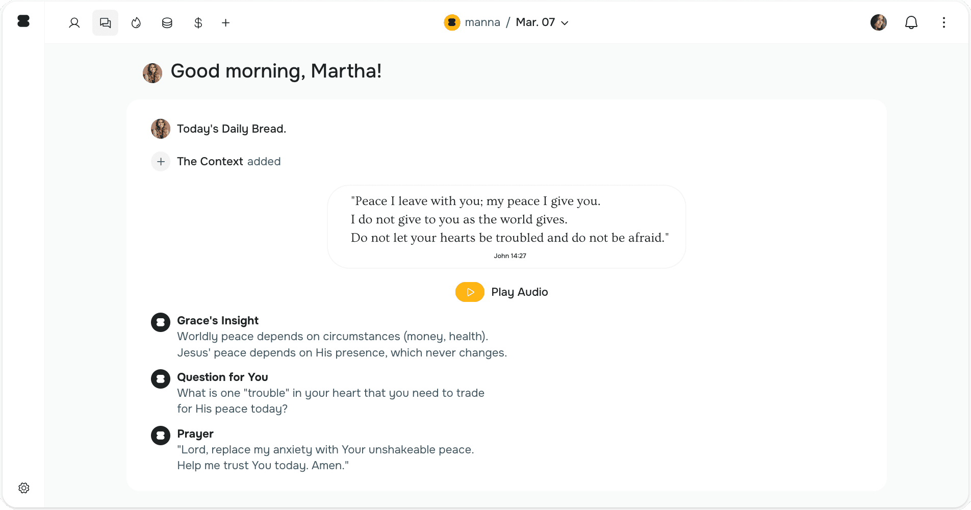 Save your favorite verses and chat history. Your personal spiritual archive.